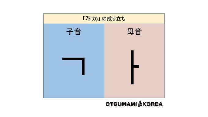 子音の「ㄱ」と母音の「ㅏ」を合わせて「가(カ)」という一つの文字になります。