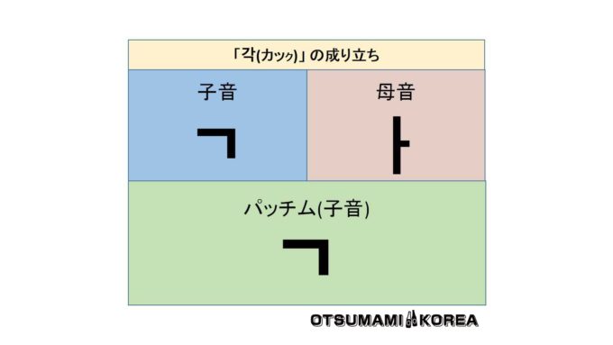 なので上の図は子音の「ㄱ」と母音の「ㅏ」さらにパッチムの「ㄱ」が合わさって「각(カッ[ク])」という一つの文字になります。